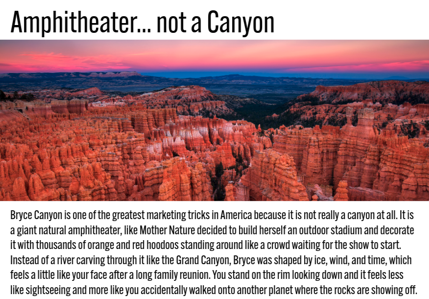 The red rock hoodoos is one of the most picturesque sights you’ll find anywhere in the world and hiking the canyon trail is an amazing experience. But be warned… that final stretch of the hike is an absolute killer. It turns into a winding, grueling, hands-above-your-head march straight uphill. It is pure misery, your legs are on fire, your lungs are questioning your life choices, and every step feels like punishment. But then you reach the top, and suddenly none of it matters. You look out across those towering red spires capped in white, and it feels like the canyon is showing off just for you. Suddenly, the suffering feels less like torture and more like the price of admission.