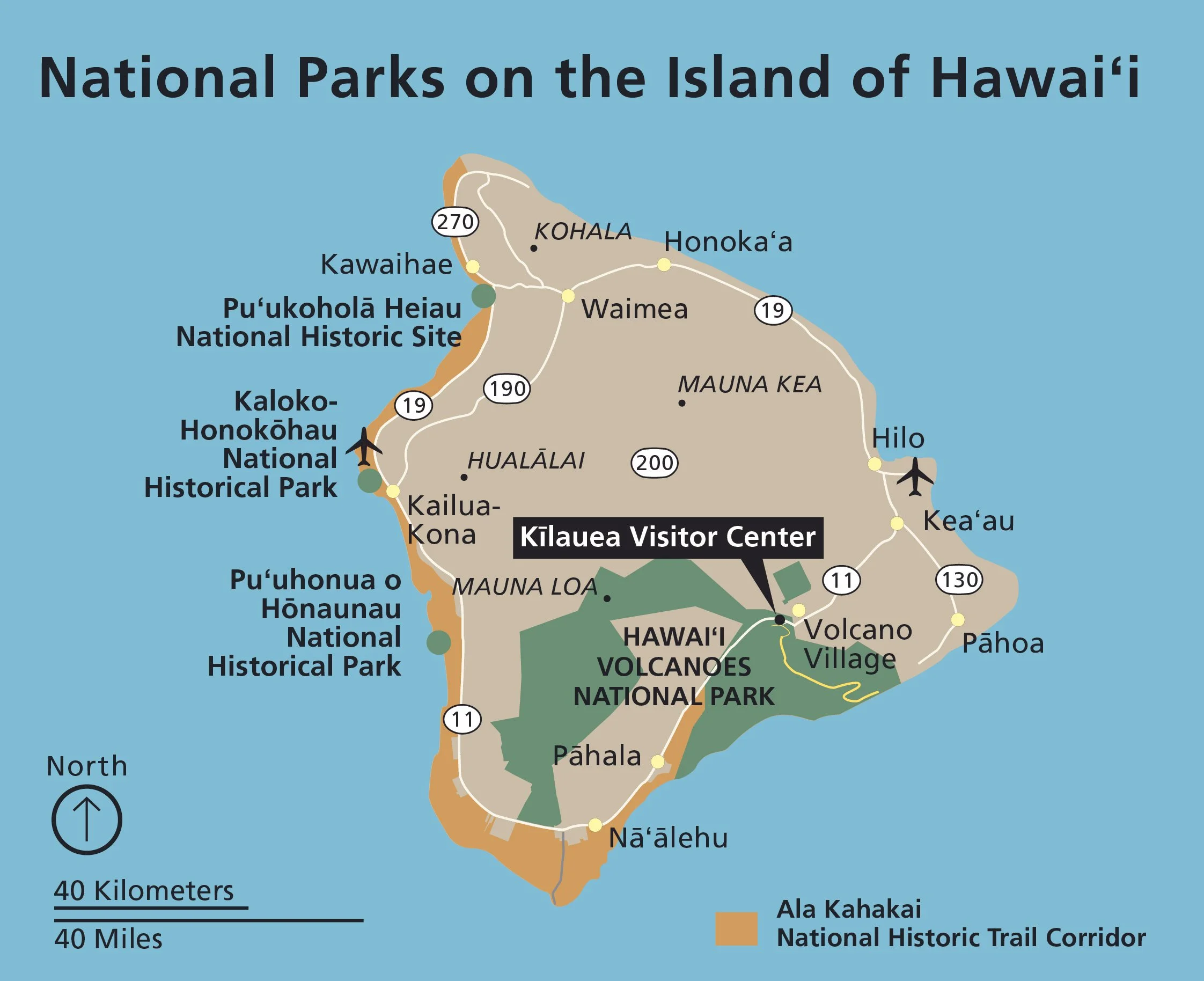 Hawaiʻi Volcanoes National Park is an American national park located in the U.S. state of Hawaii on the island of Hawaii. The park encompasses two active volcanoes: Kīlauea, one of the world's most active volcanoes, and Mauna Loa, the world's largest shield volcano.